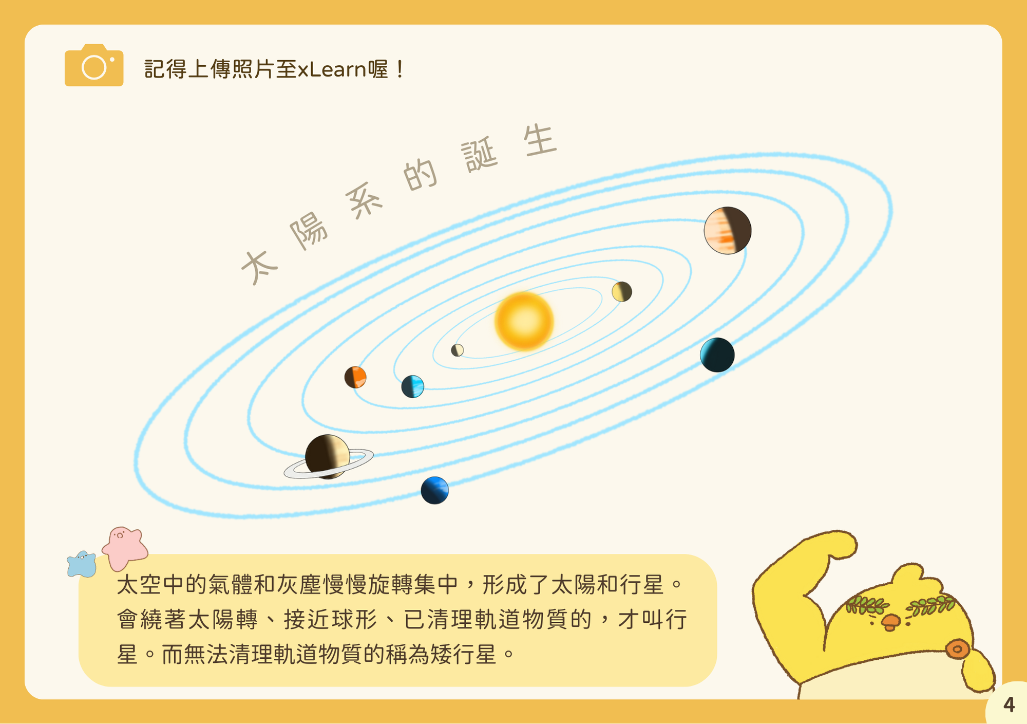 評量 Evaluation 1: 太陽系誕生於一團原始星雲。這團星雲在自身重力作用下逐漸塌縮,中心區 域的密度、溫度愈來愈高,最終引發核融合反應,太陽因此誕生。請問目前太陽系的年齡約為多少年? 請參考展示場二樓:太陽系的誕生