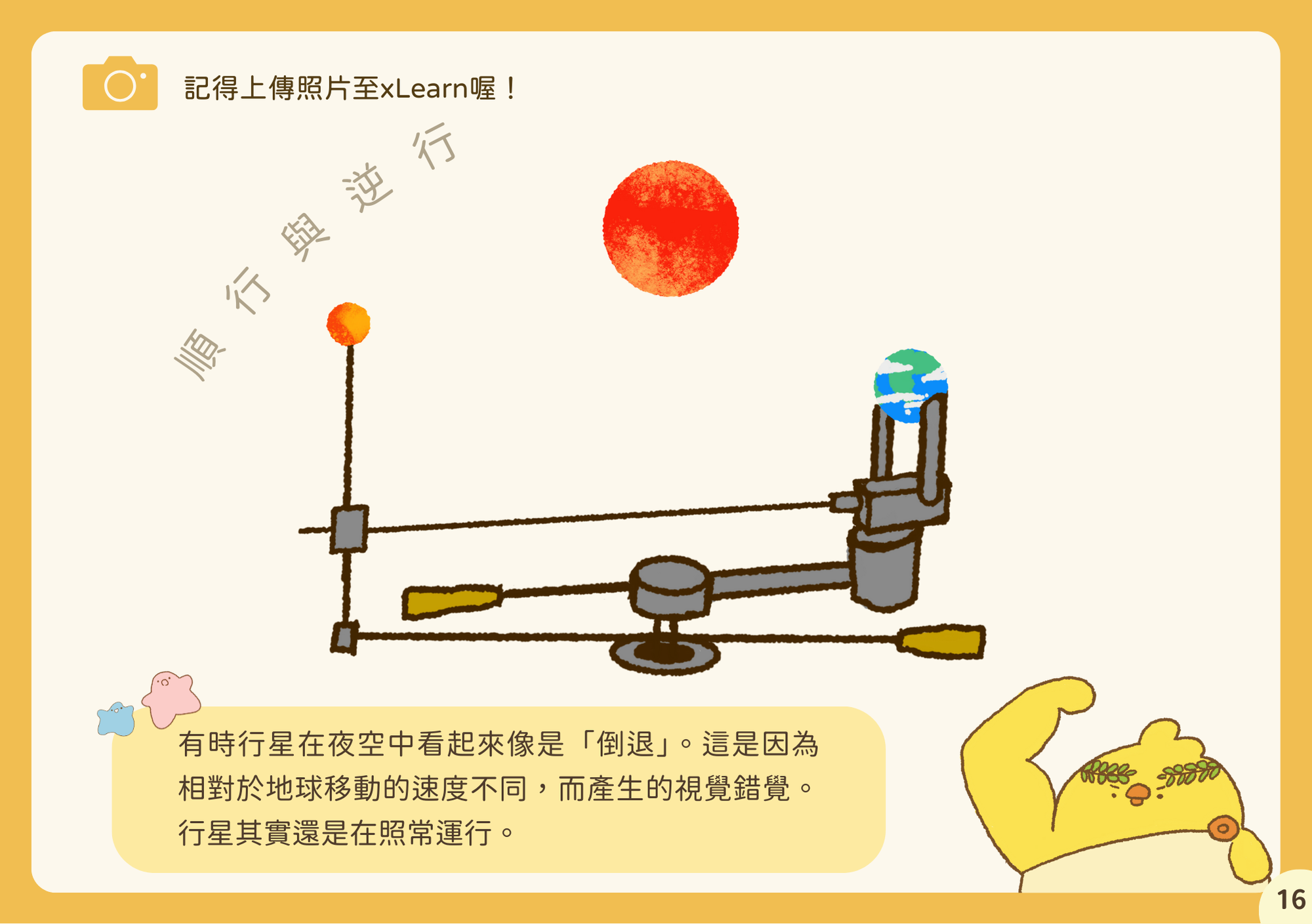 評量 Evaluation 1: 在地球上長期觀看火星,會發現其軌跡有時停止、有時回頭運行;但實際上火星一直穩定地在軌道上持續前進。請問誰宣揚了什麼說法,可以正確而簡單的解釋「行星逆行」? 請參考展示場三樓:順行與逆 行