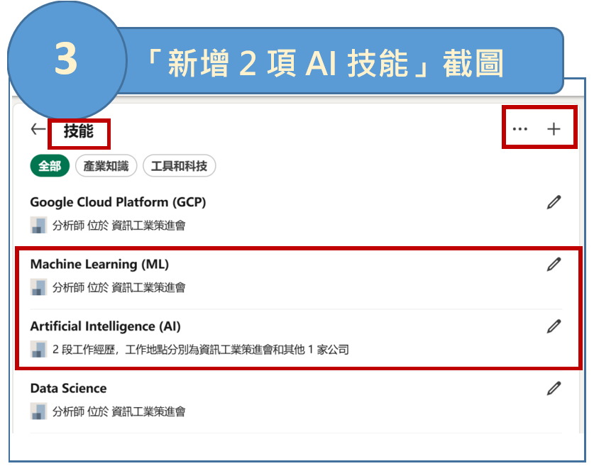 ⭐ STEP 2 截圖「個人技能」,技能更新前一張,新增至少2項AI技能後再截圖一張(Artificial Intelligence (AI)相關技能如: Artificial Intelligence (AI)、ChatGPT、Generative AI、Edge AI、Prompt Engineering、Machine Learning...等AI工程或AI素養相關專業技能)